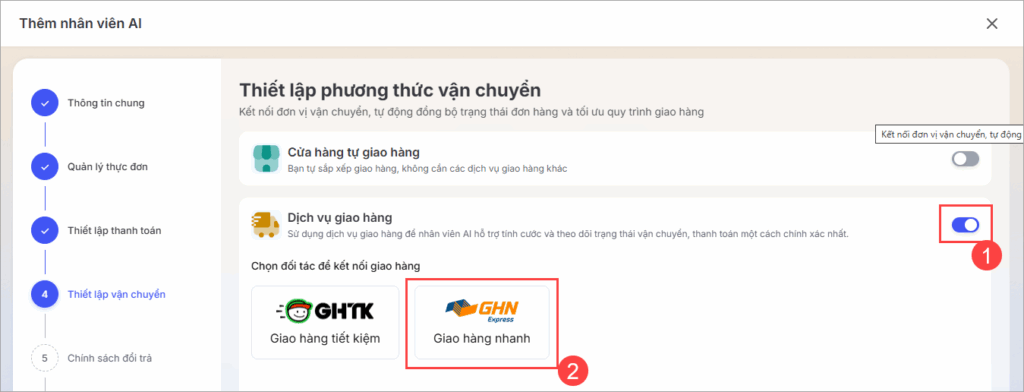 1. Khi tạo nhân viên AI, tại bước Thiết lập vận chuyển, chọn Dịch vụ giao hàng, chọn Giao hàng nhanh.