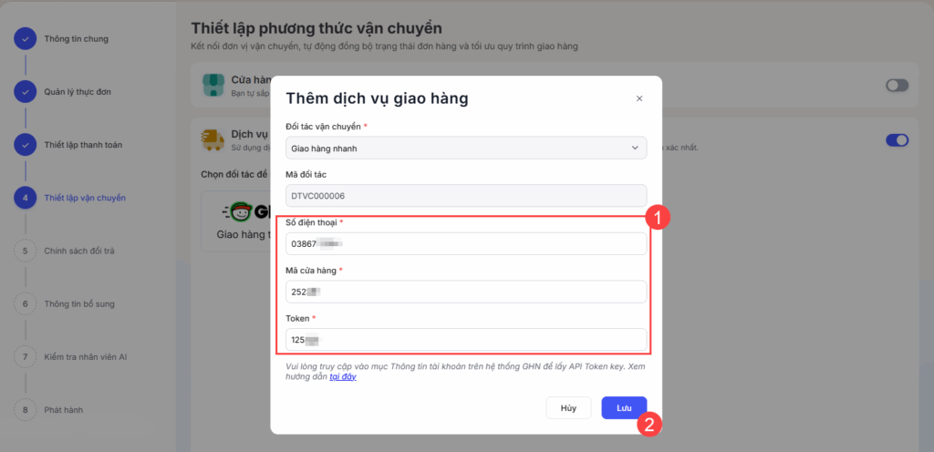 - Mã cửa hàng, Token: Xem hướng dẫn lấy thông tin mã cửa hàng, token đơn vị vận chuyển Giao hàng nhanh để kết nối tại đây.