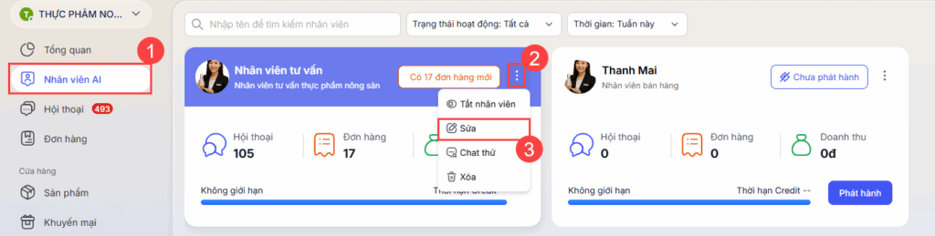 1. Tại nhân viên AI đã phát hành cần bổ sung đối tác vận chuyển, nhấn biểu tượng 3 chấm, chọn Sửa.