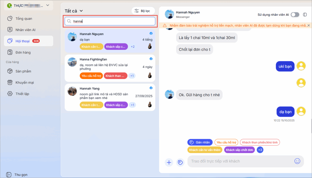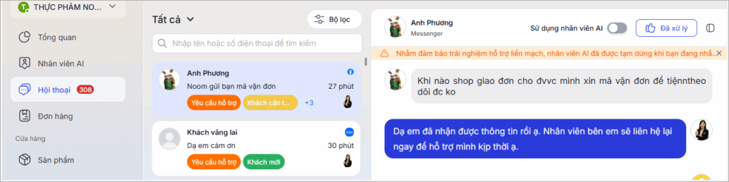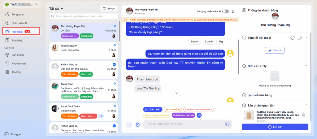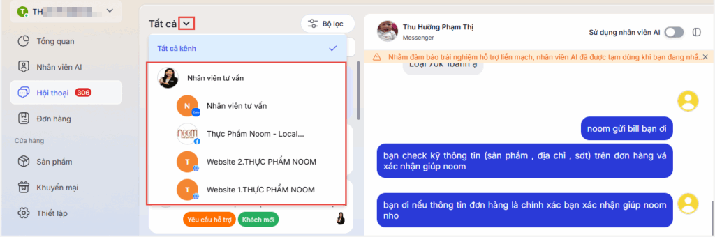 Hướng dẫn shop quản lý và theo dõi toàn bộ các cuộc trò chuyện mà nhân viên bán hàng AI đã tư vấn cho khách hàng. Các cuộc hội thoại này được tổng hợp từ tất cả các kênh như Facebook Messenger, Website, và các kênh bán hàng có tích hợp nhân viên AI.