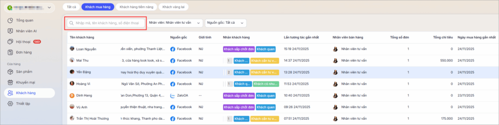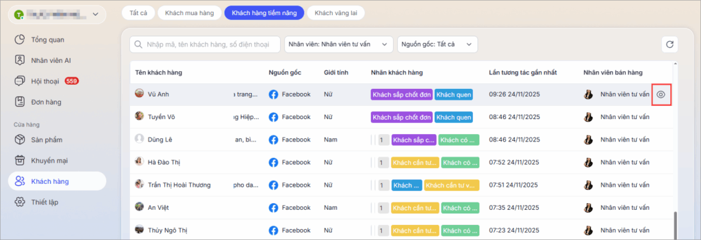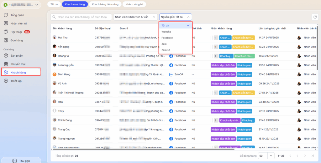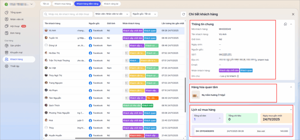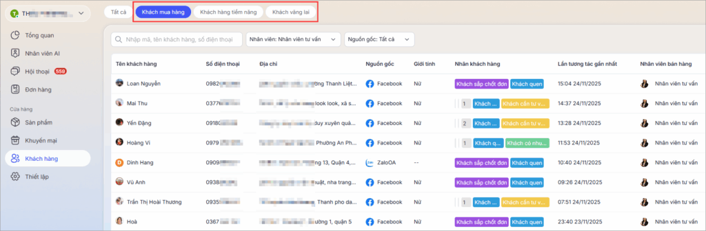 2. Hệ thống phân loại khách hàng qua 3 trạng thái chính: Khách mua hàngKhách hàng tiềm năng, và Khách vãng lai