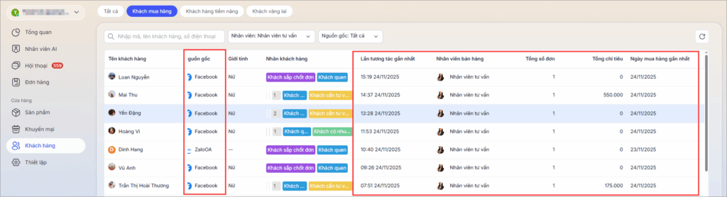 1. Vào mục Khách hàng, tại đây, hệ thống hiển thị toàn bộ thông tin khách hàng đã chat với shop qua tất cả các kênh như: Website, Facebook, Zalo, Zalo OA.