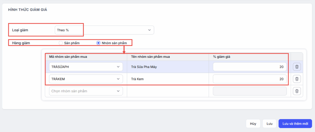 • Hàng giảm: Chọn Sản phẩm nếu giảm giá cho từng sản phẩm đơn lẻ, chọn Nhóm sản phẩm để giảm cho nhóm.