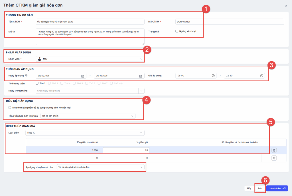 Lưu ý: Tất cả đơn hàng phát sinh đúng điều kiện trong ngày 20/10 sẽ được tự động giảm 20% hóa đơn, theo thiết lập trên. Nhân viên AI sẽ áp dụng chương trình khuyến mãi khi lên đơn.