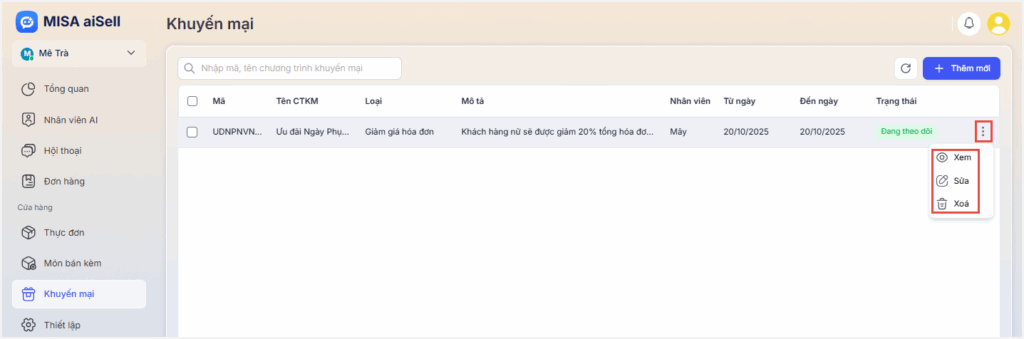 Lưu ý: Có thể chỉnh sửa hoặc xóa chương trình khuyến mại trong mục Khuyến mại.