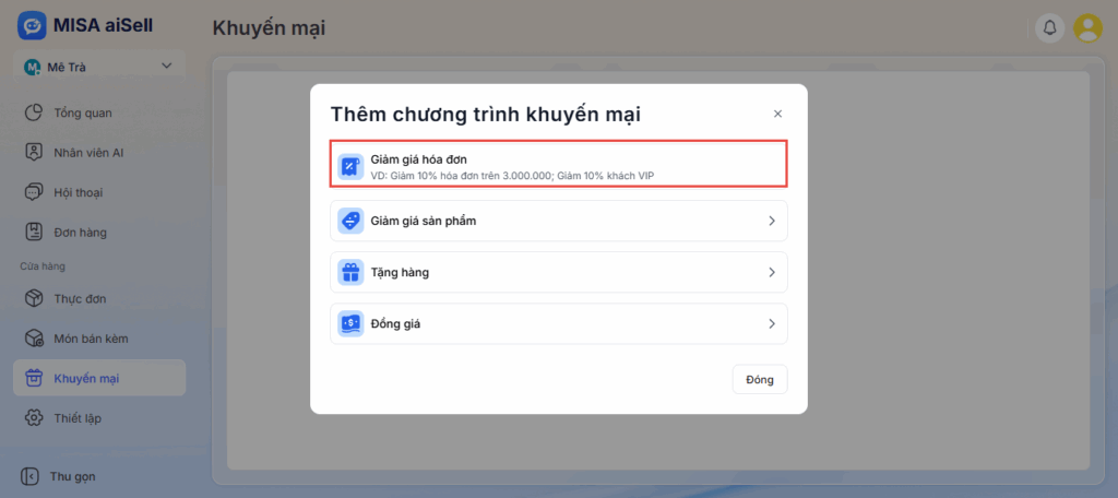 • Loại giảm: Chọn giảm giá theo % hoặc theo tổng tiền hóa đơn.