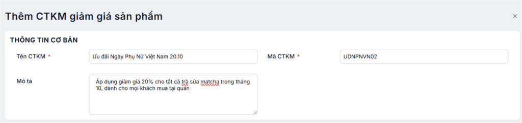 • Tên CTKM: Đặt tên dễ nhớ, phù hợp dịp khuyến mãi để dễ quản lý.