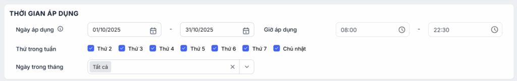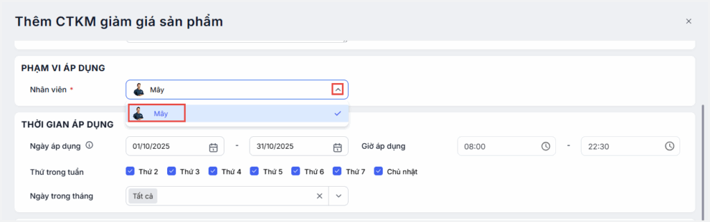 • Ngày áp dụng: Điền ngày áp dụng chương trình khuyến mại.