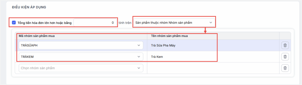 • Nếu chỉ áp dụng cho đơn hàng đạt giá trị tối thiểu, tick vào Tổng tiền hóa đơn lớn hơn hoặc bằng và nhập giá trị, chọn phạm vi sản phẩm.