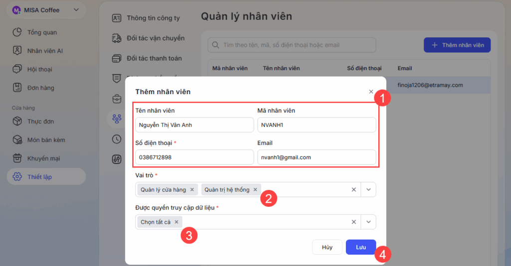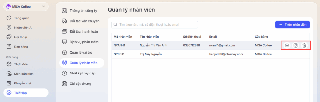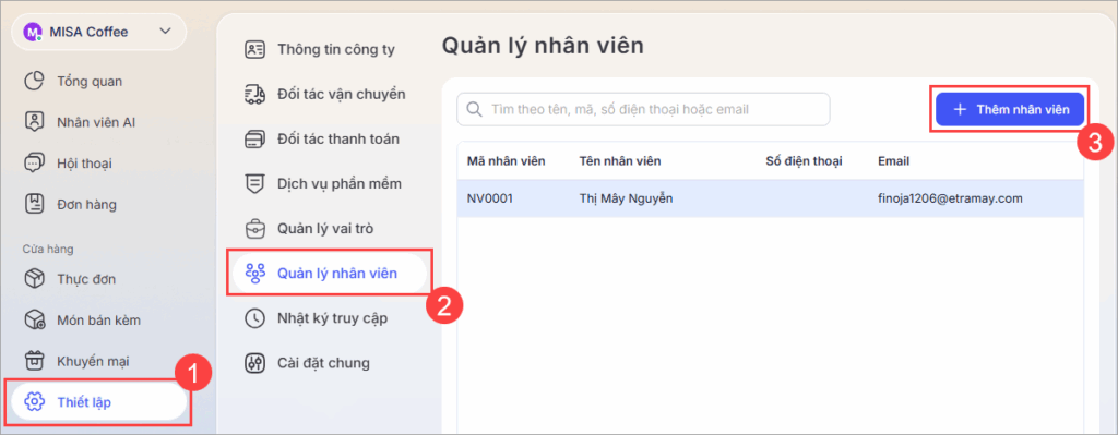 1. Vào mục Thiết lập, chọn Quản lý nhân viên, nhấn Thêm nhân viên.