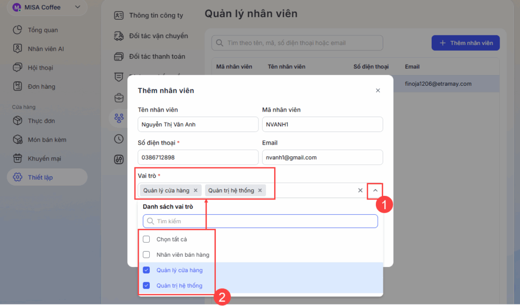 • Vai trò: Chọn vai trò cho nhân viên từ danh sách. Vai trò sẽ quyết định các quyền hạn của nhân viên trên hệ thống. Để biết quyền hạn của từng vai trò, xem tại đây.
