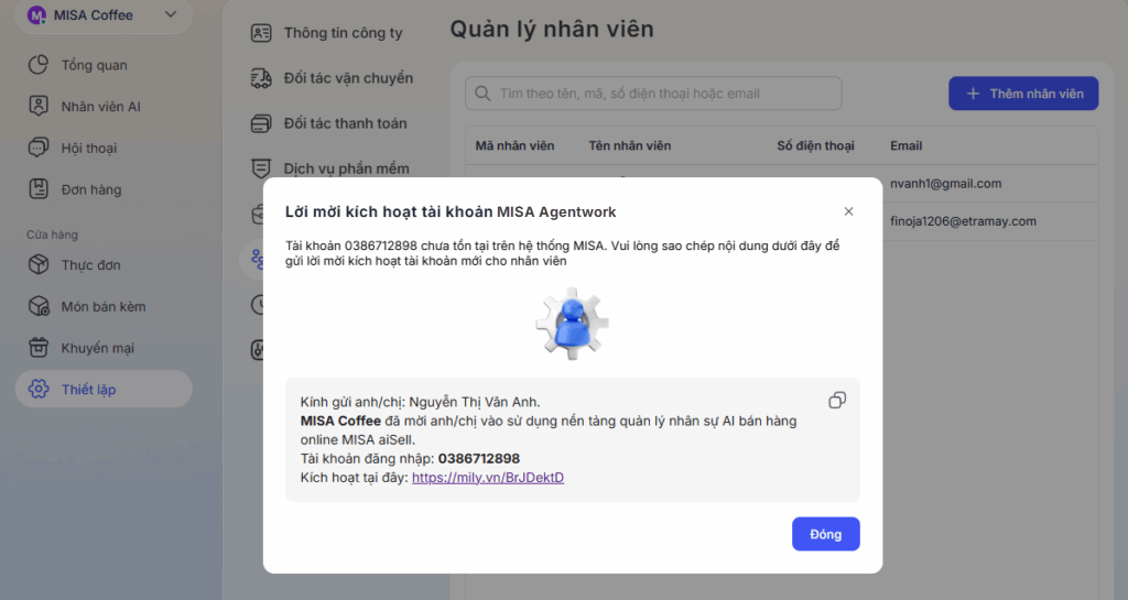 3. Chương trình lưu nhân viên vào danh sách đồng thời hiển thị nội dung để gửi cho nhân viên được phân quyền kích hoạt tài khoản.