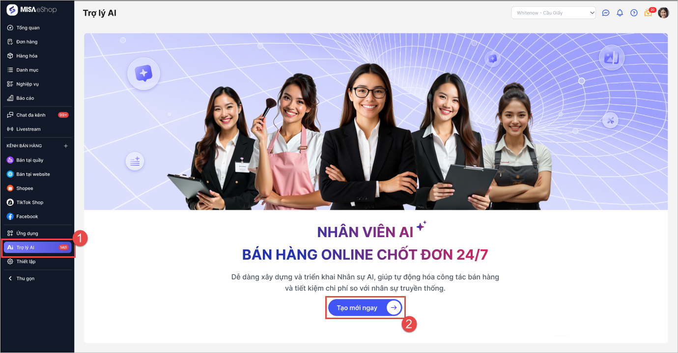 - Trên phần mềm bán hàng MISA eShop, mở phân hệ Trợ lý AI, chọn Tạo mới ngay.