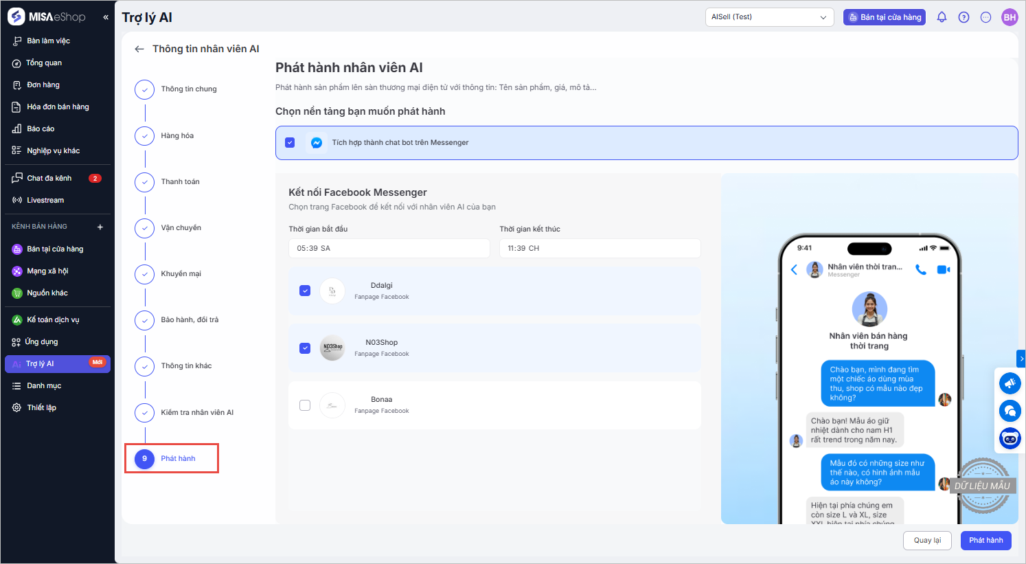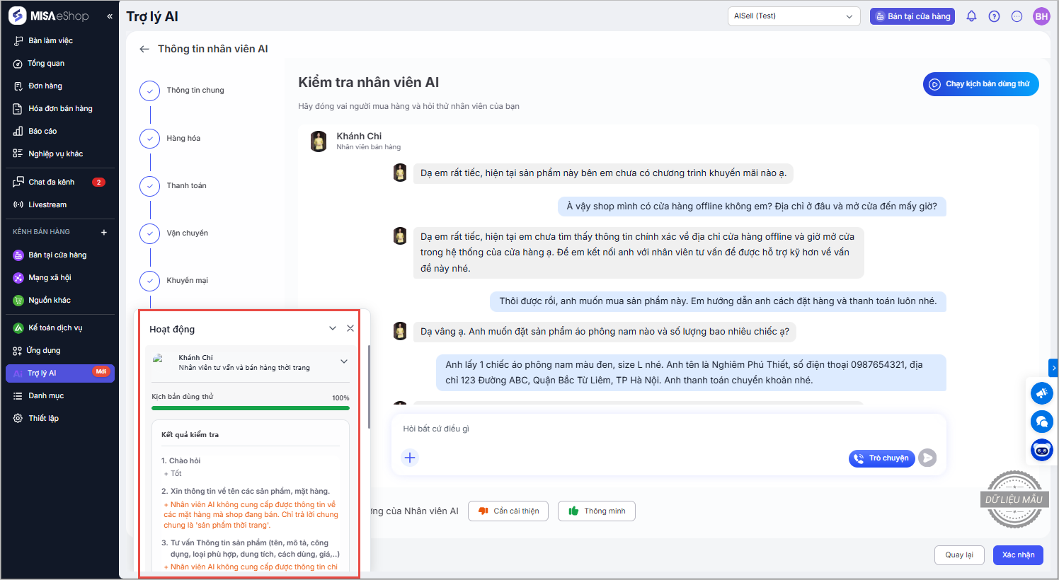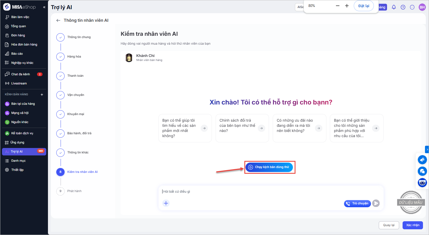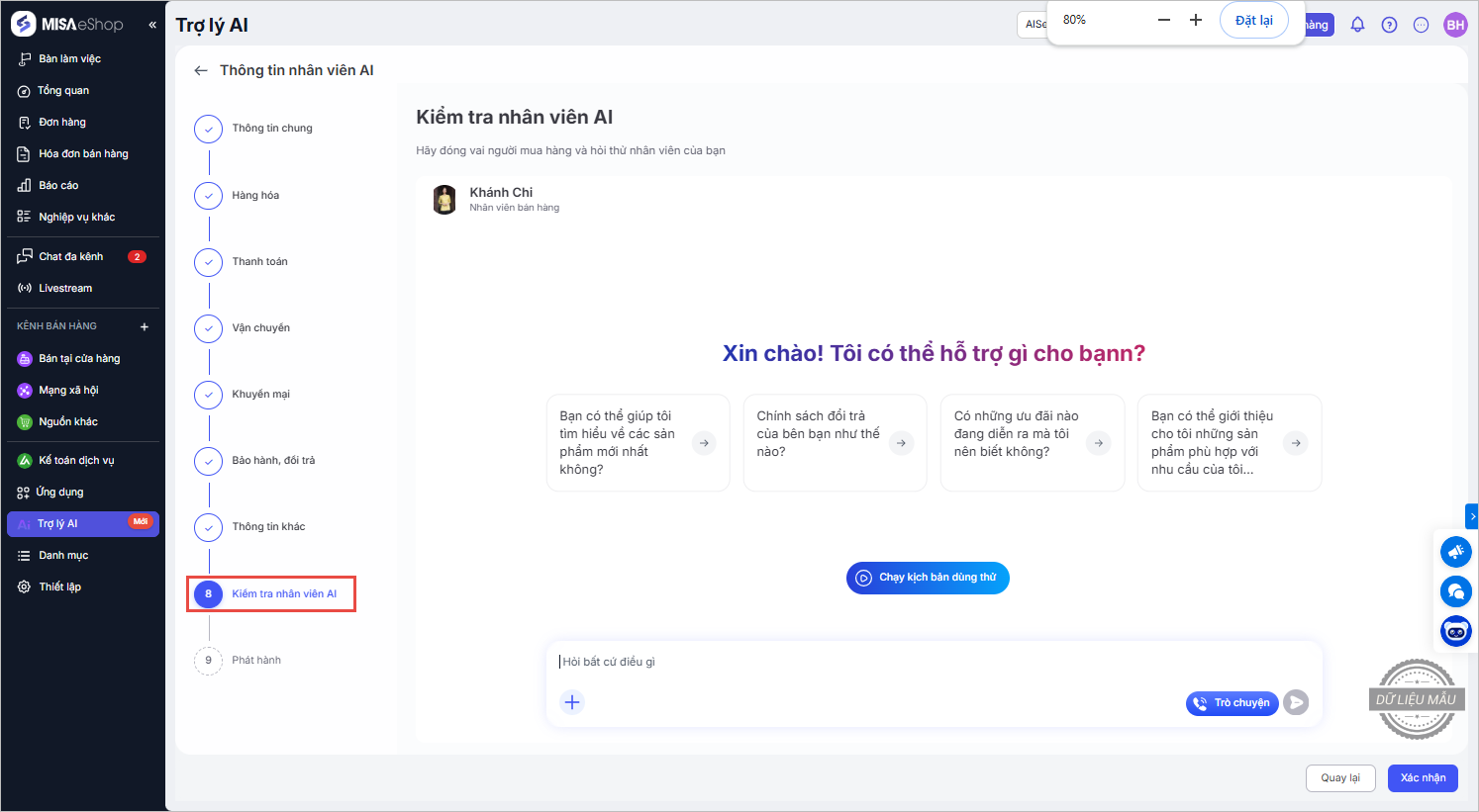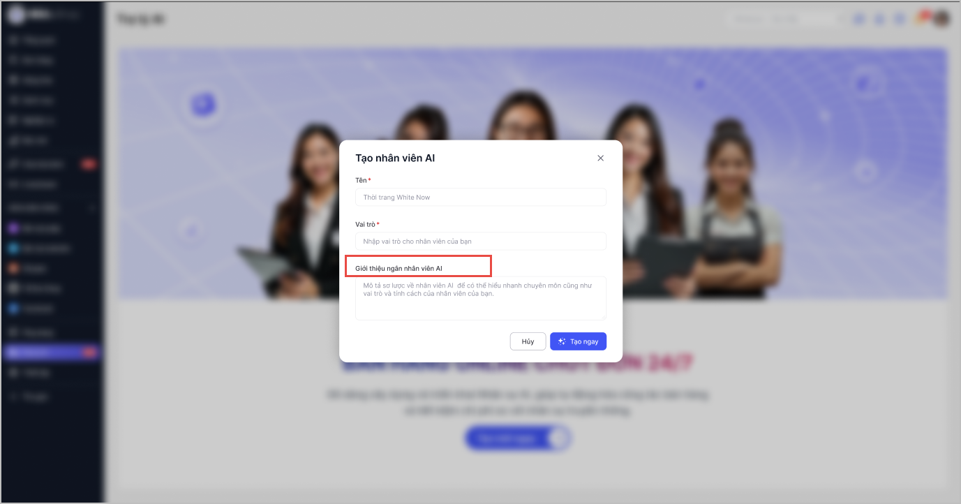 - Nhấn Tạo ngay, chương trình tự động thiết kế một nhân viên AI phù hợp với ngành nghề kinh doanh của cửa hàng và tự động điền các thông tin đã khai báo ở bước trước.