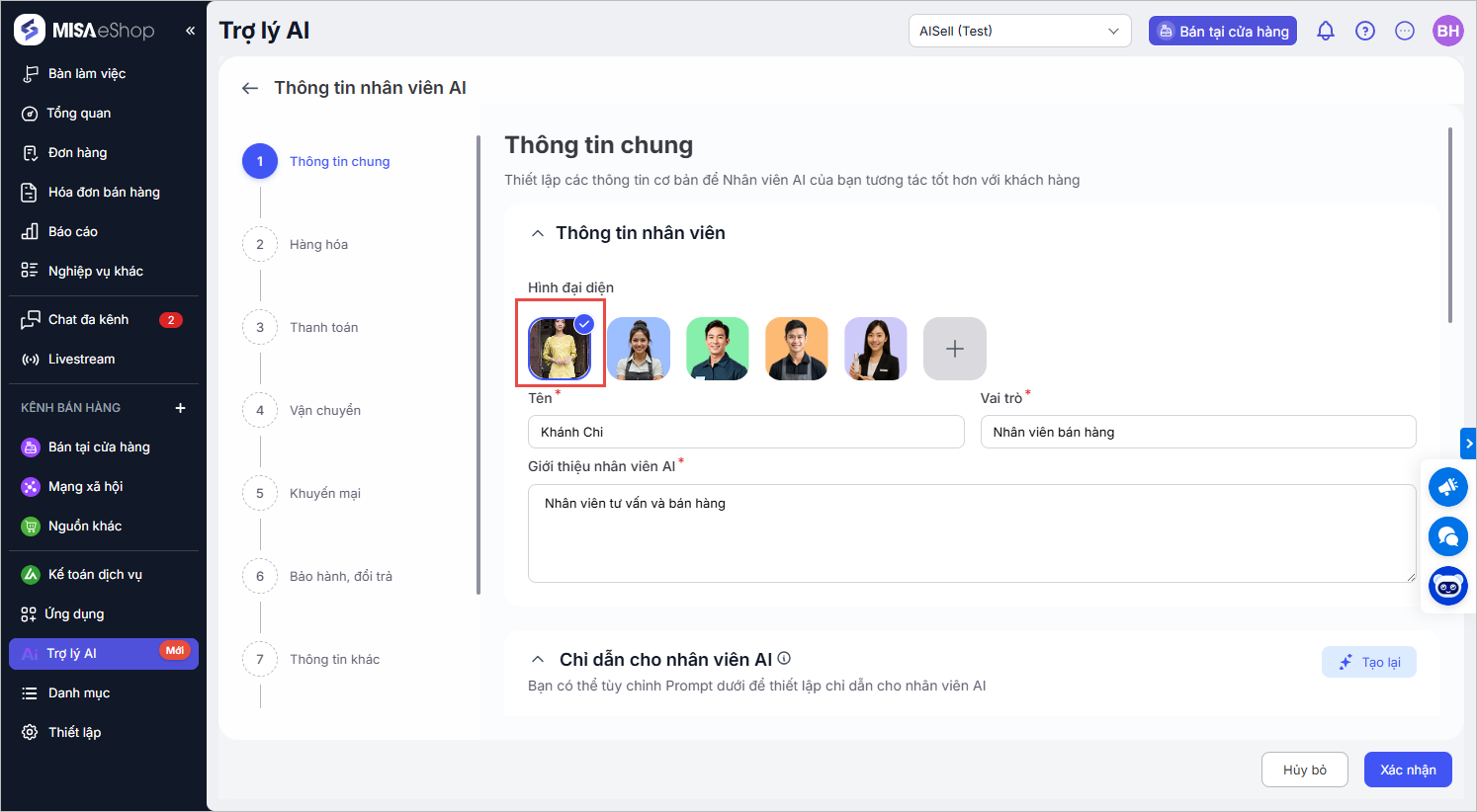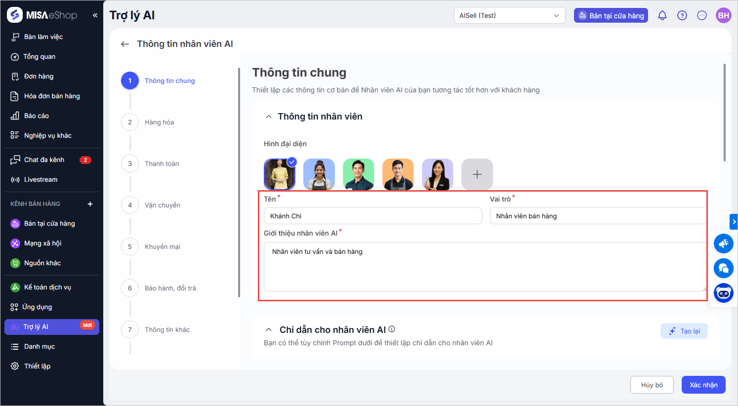 – Vai trò: Nhập vai trò mà nhân viên AI đảm nhận (Ví dụ: Nhân viên bán hàng thời trang)